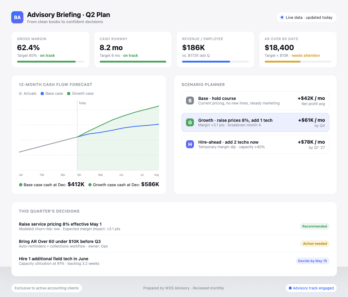 Once your foundation is solid and you understand what your numbers are telling you, the door to advisory opens. This is where we help you use your data to make real decisions — profitability, cash flow, hiring, operations, and growth. Available exclusively to existing accounting clients through a structured track.